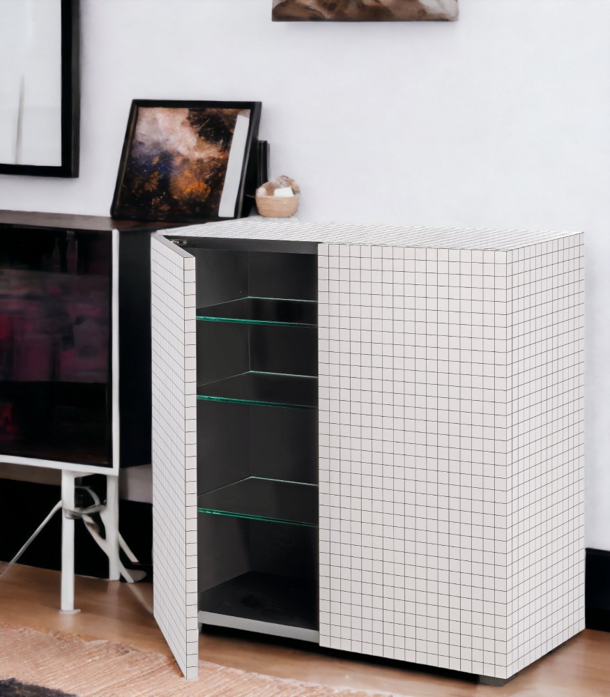 L'armoire est faite de contreplaqué avec un imprimé blanc, du verre cristal. L'armoire mesure 104 cm de large, 42 cm de profondeur et 105 cm de hauteur.
