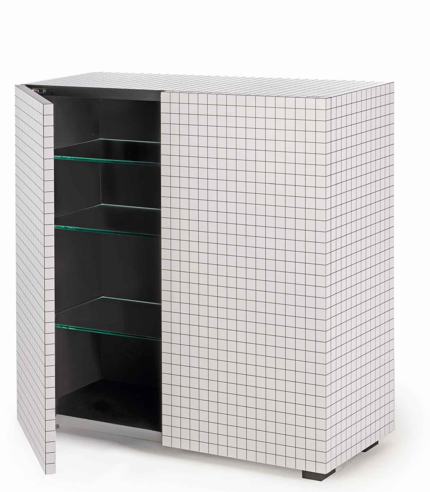 Jusqu'à aujourd'hui, les meubles Quaderna sont une vision particulière d'une collection intemporelle et tout à fait élégante. Le stratifié blanc carré recouvre les meubles et crée des paysages architecturaux.