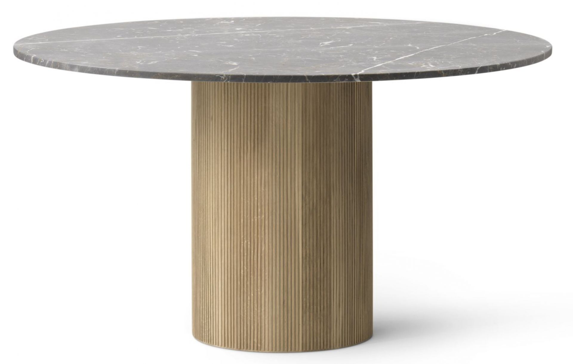 La table Cabin de vipp avec une base en chêne clair laqué mesure 73 cm de haut et 130 cm de diamètre. Pour le plateau de table , tu peux choisir entre les couleurs marbre gris et marbre du Jura.