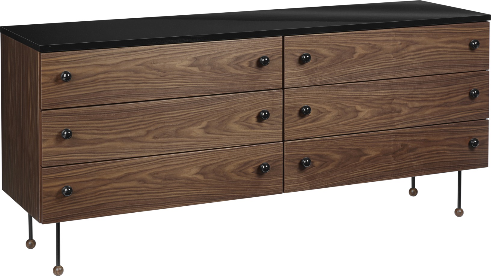 Le placage du bureau est en noyer américain. Les accents noirs sont créés par le laminé noir brillant. Les pieds métalliques du bureau sont revêtus de poudre noire. Le sideboard mesure 160 cm de large, 45 cm de profondeur et 72 cm de hauteur.