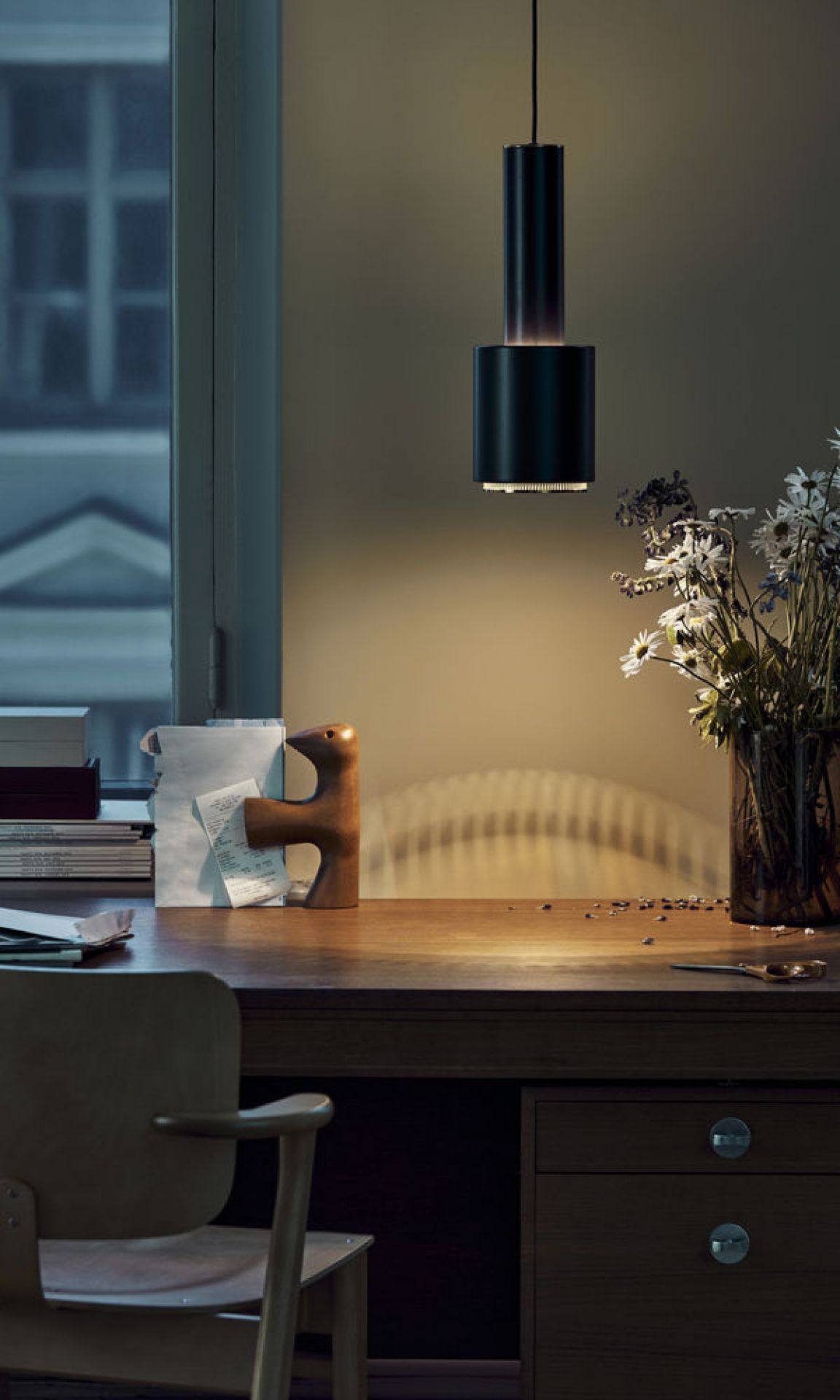 Cette élégante lampe suspendue est surnommée "Grenade à main" en raison de sa forme saisissante. La lampe suspendue A110 crée une combinaison de lumière directe et indirecte grâce à un abat-jour en acier et un anneau intérieur, qui fournit un éclairage fonctionnel ainsi qu'un éclairage d'ambiance. Conçu à l'origine en 1952 par Alvar Aalto pour l'Association des ingénieurs finlandais, ce design minimaliste peut également être mis en scène dans le salon avec des accents particuliers. Il est particulièrement apprécié lorsqu'il est utilisé en rangée au-dessus des éléments de cuisine.