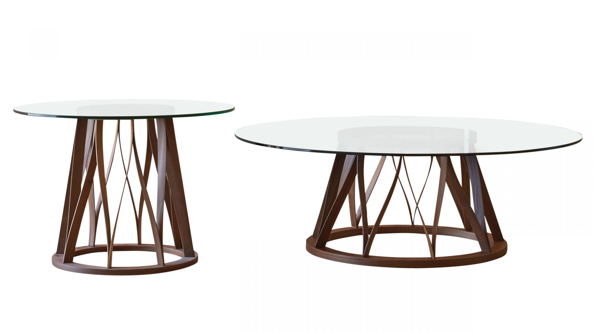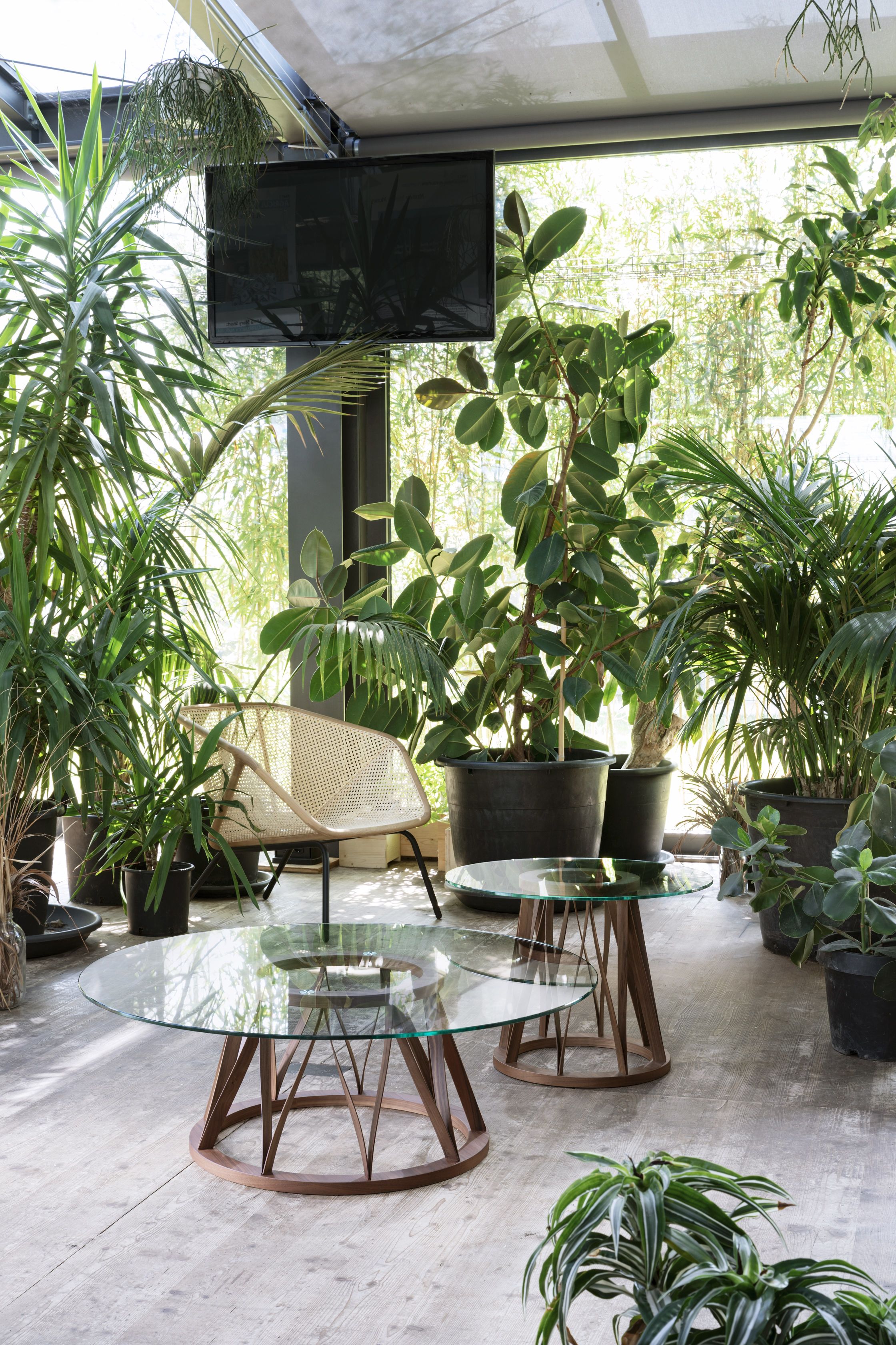 Le plateau de table de 0,8 cm d'épaisseur est fabriqué en verre transparent et flotte sur un piètement avec une finition en noyer Canaletto. Acco est disponible en tant que table d'appoint (Ø 62 x H 44 cm) ou table basse (Ø 100 x H 34 cm).