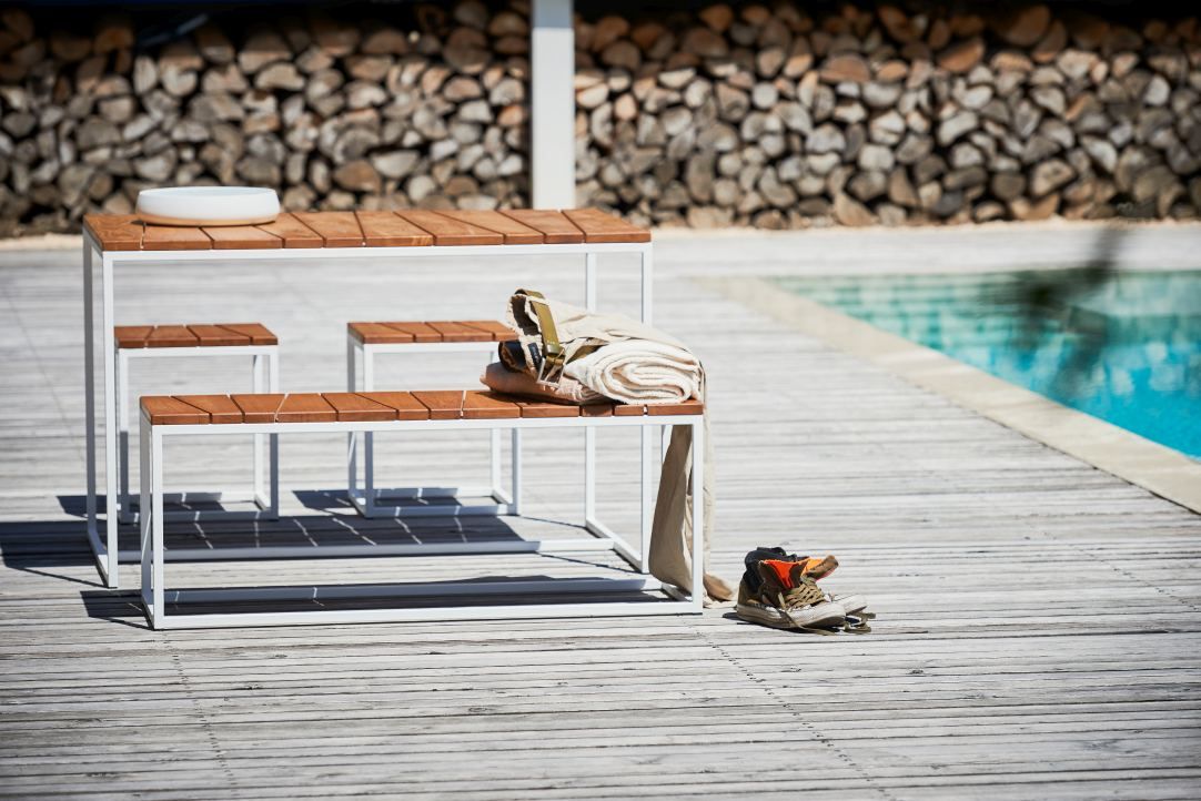 Le studio de design interdisciplinaire Besau-Marguerre a créé une combinaison de tables unique et de caractère avec l'ensemble de tables Alois. La symbiose entre la structure en acier noir et le motif en bois spécialement disposé crée une atmosphère agréable qui convient merveilleusement bien pour s'asseoir à l'extérieur. Comme coin repas dans le jardin, sur la terrasse ou le balcon - c'est un plaisir de manger et de bavarder. Pratique : l'ensemble de quatre pièces se replie pour gagner de la place. Ainsi, le banc et le tabouret se glissent facilement sous la table.