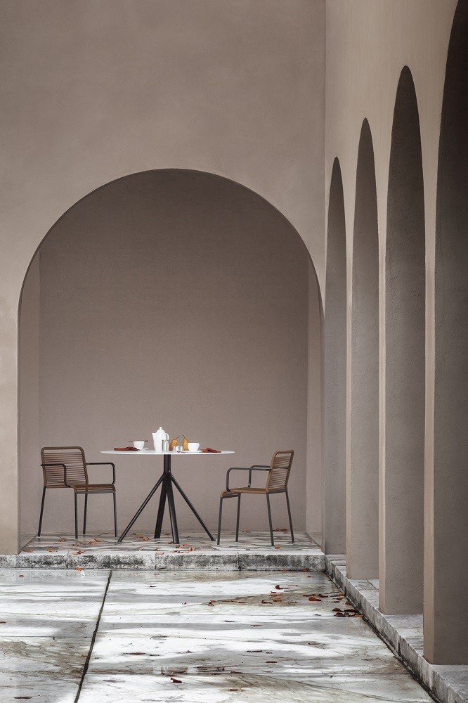 La chaise Aria est fabriquée en acier inoxydable et en cordes de polyester tressées à la main.