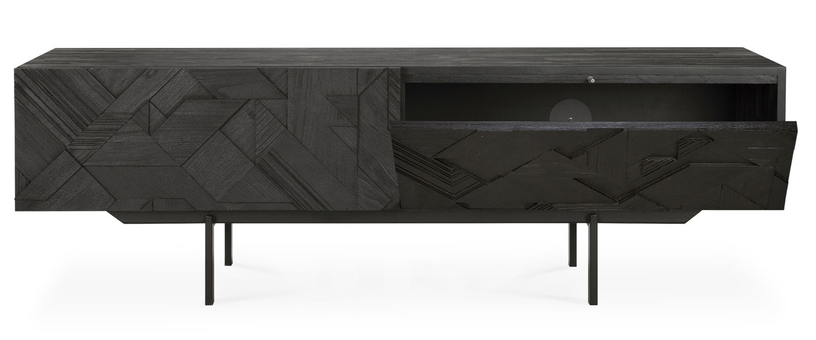 Le meuble TV Graphic est réalisé en bois de teck massif brossé, affiné par une laque noire. Combiné au cadre métallique noir, il crée un look imposant. Le mobilier design est disponible en deux versions :