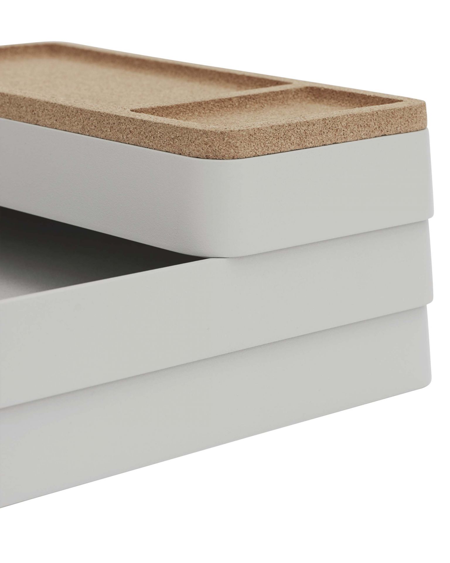 Les bols du système Arrange sont fabriqués en plastique 100% recyclé à partir de polypropylène post-consommation. De plus, des couvercles en liège ou en aluminium anodisé sont disponibles. La configuration 1 se compose de trois parties qui, une fois assemblées, ont les dimensions totales suivantes : L 25 x P 32 x H 11 cm.
