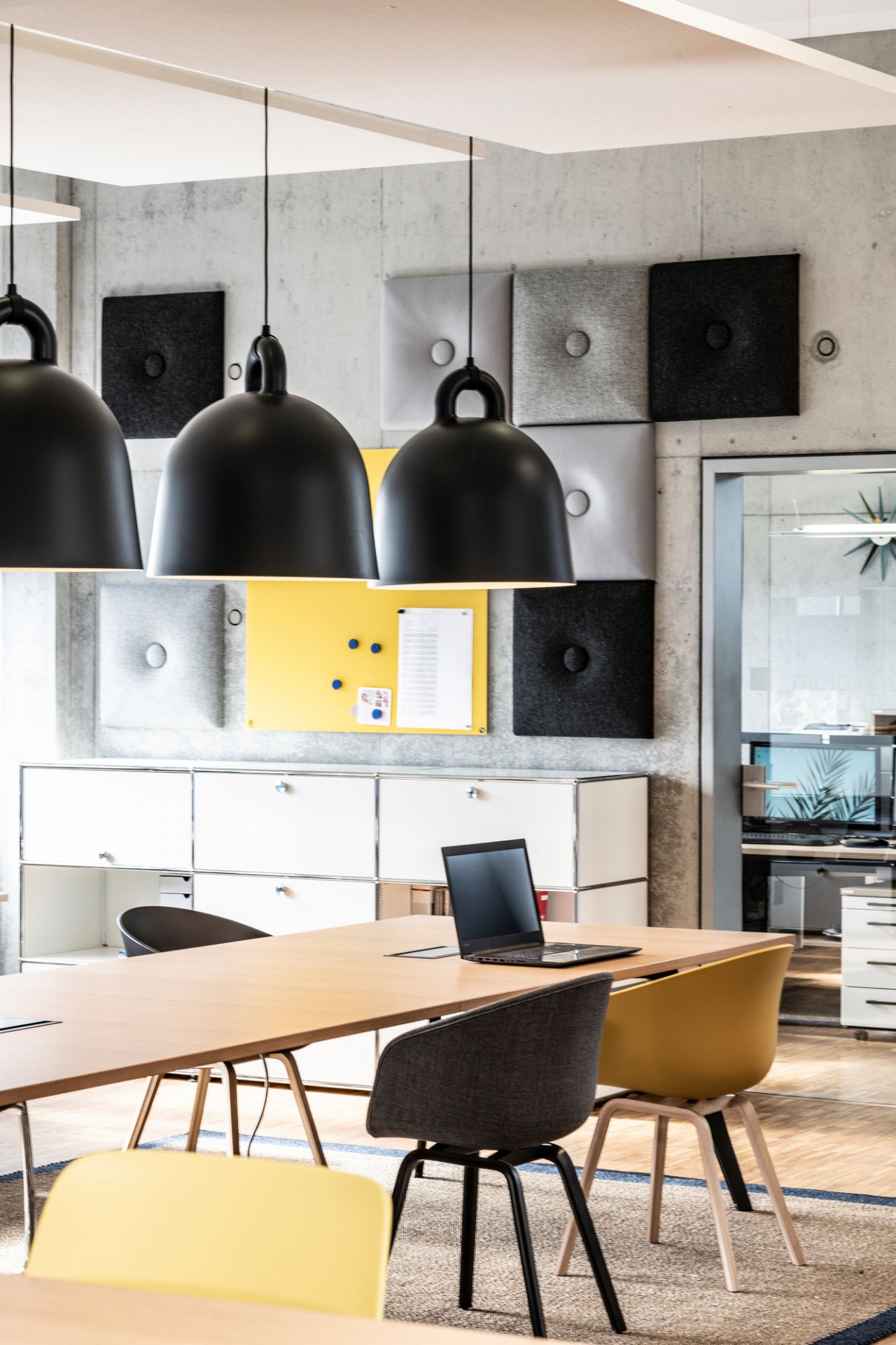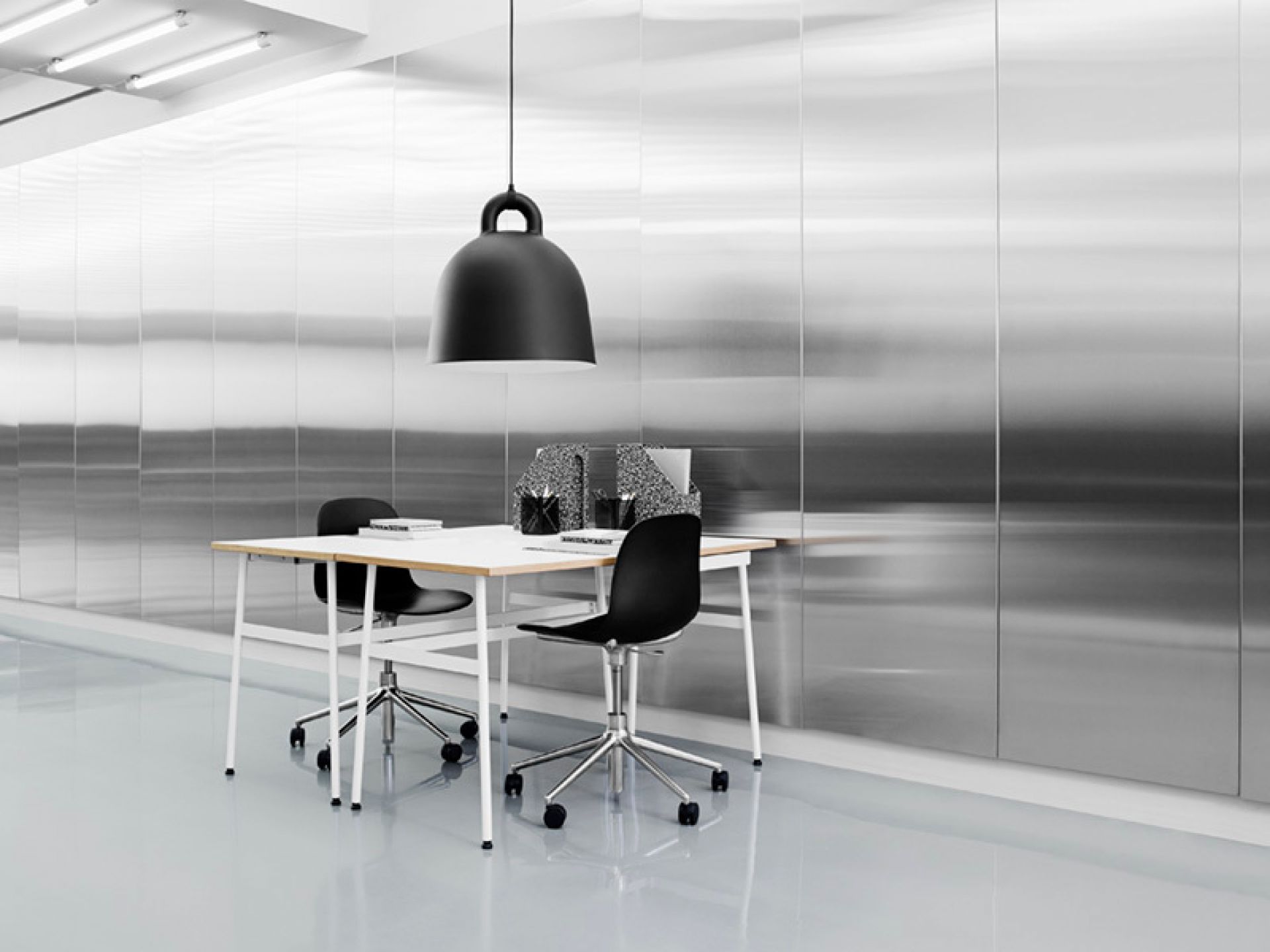 Un extérieur robuste allié à une forme simple - la lampe suspendue Bell Lamp de Normann Copenhagen convainc par son aspect industriel et convivial. Elle convient donc aussi bien à une utilisation dans des pièces privées que dans les bureaux.