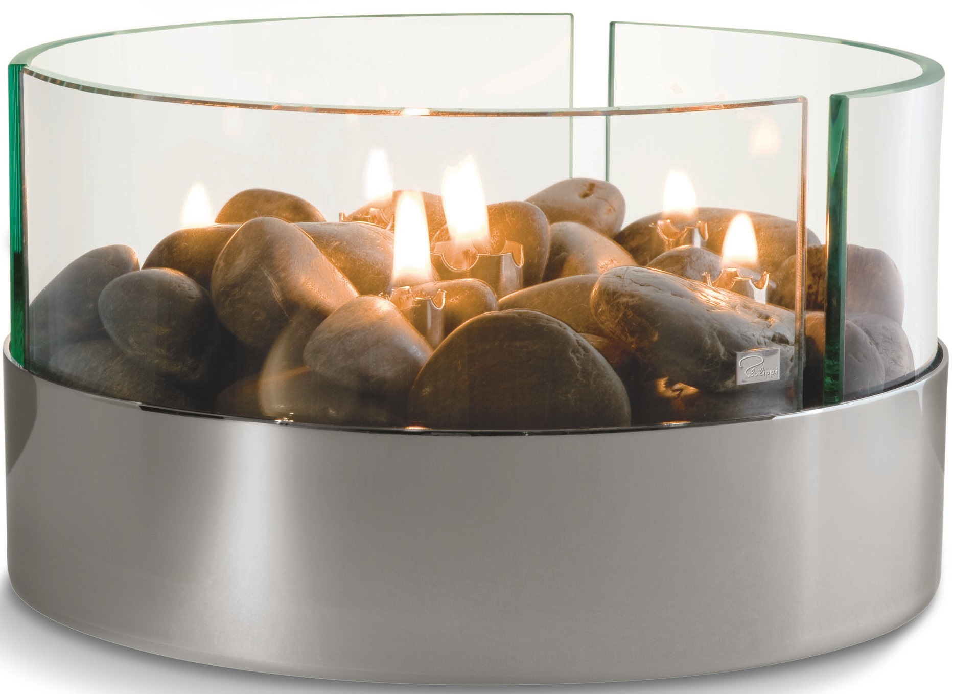 L'idée vient des bougies à l'huile de lampe rechargeables que l'on trouve souvent dans les restaurants de la région méditerranéenne. Ainsi, la cheminée de table est remplie de galets de rivière qui remplissent de manière décorative l'espace entre les différentes mèches en fibre de verre.