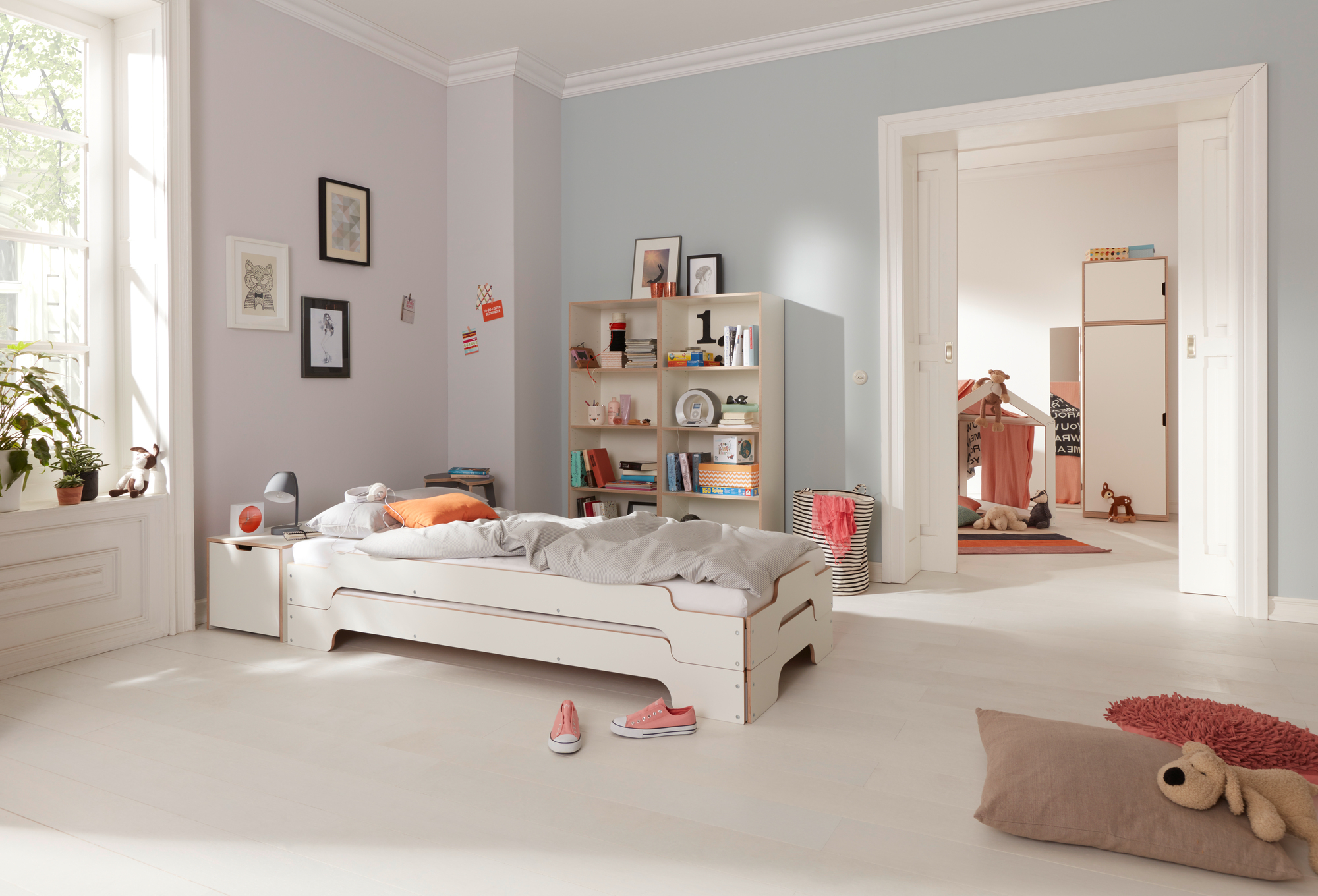 Le caisson de lit se compose du matériau classique de Müller Möbelwerkstätten : du contreplaqué, en l'occurrence du contreplaqué à 9 couches collé d'une épaisseur de 15 mm. Les parties latérales brillent dans le plus beau blanc (revêtement CPL), les bords en contreplaqué de bouleau sont ouverts, ce qui donne quelque chose de bien particulier à cela. Le caisson de lit est livré monté.