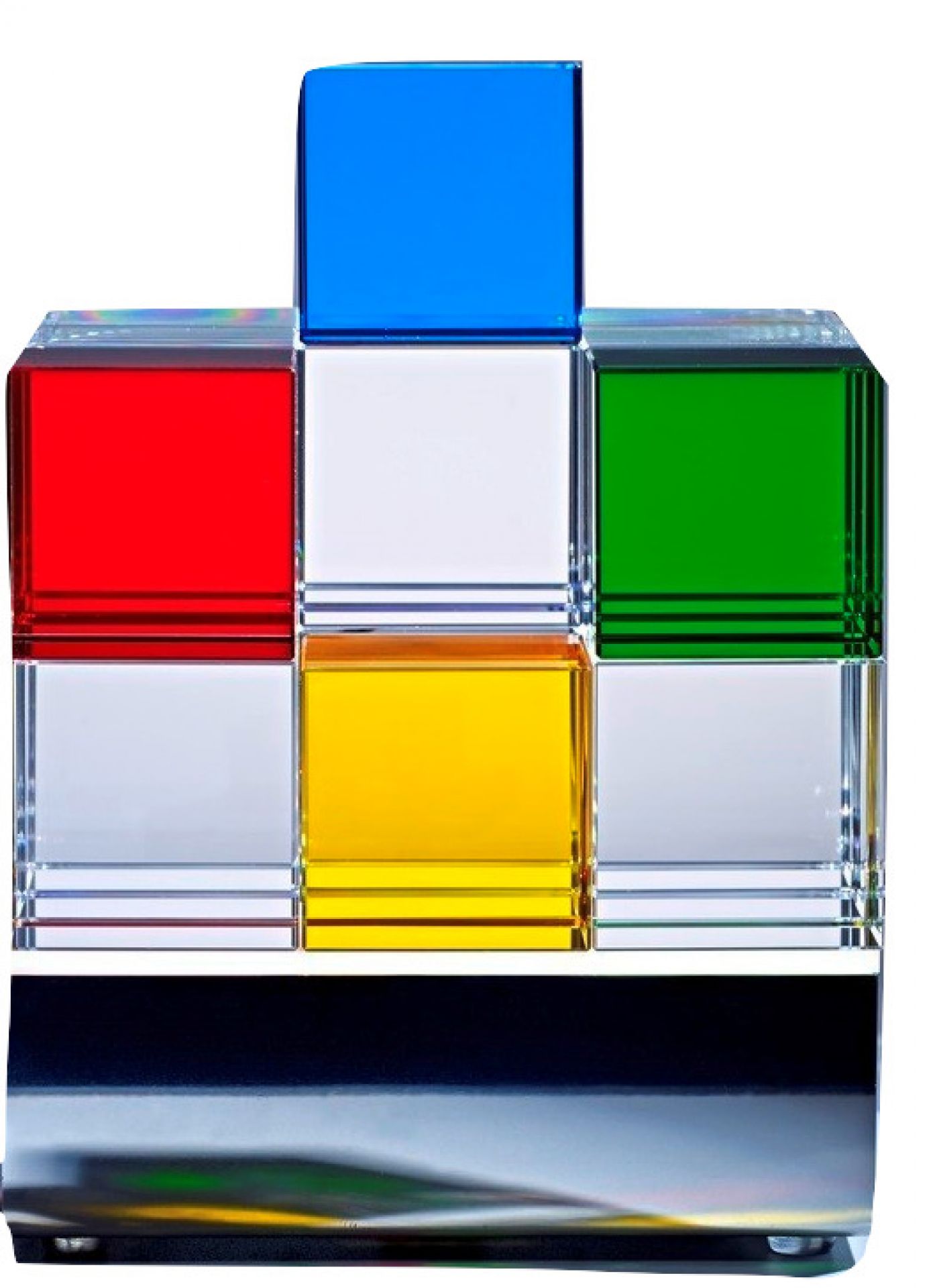 L'objet design se compose de 18 cubes de verre qui peuvent être disposés individuellement. Ils ont une longueur de bord de 5 cm et sont montés sur une base en acier inoxydable. Quatre cubes colorés en bleu, rouge, jaune et vert fournissent des reflets de couleur spéciaux, les cubes restants sont clairs. La base est de 15 x 15 cm.