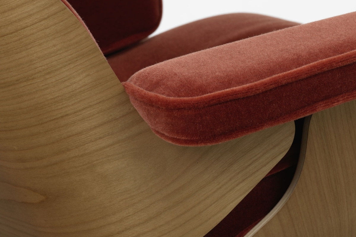 Le nouveau tissu de revêtement Calma en laine vierge naturelle séduit par son toucher doux, sa brillance noble et sa grande résistance - parfaitement assorti aux nouveaux placages en bois de l'Eames Lounge Chair. Disponible en 6 couleurs.