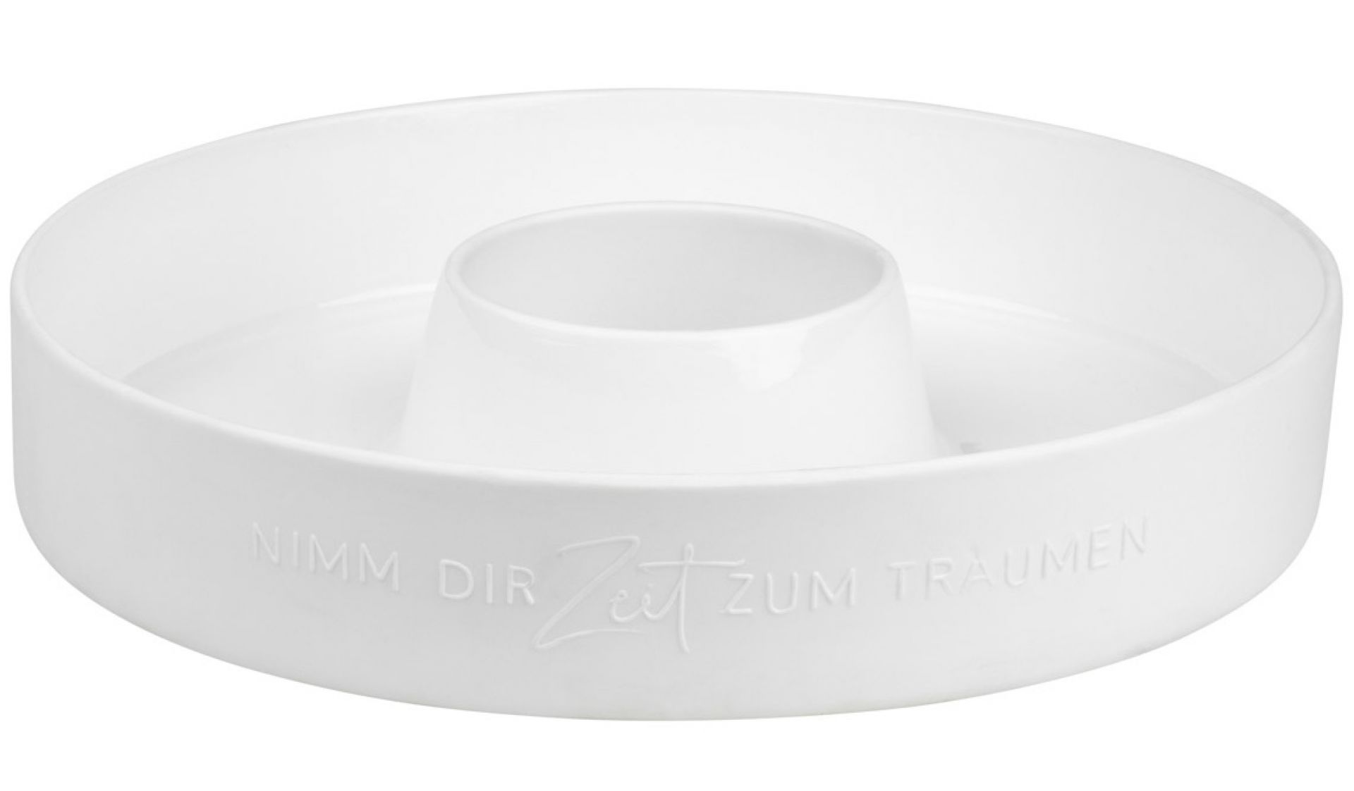Qu'elle soit décorée de bougies, de mousse et d'autres ustensiles de la forêt ou de fruits frais, la couronne de porcelaine Take your time dreaming of wheels ajoute un élément de forme à chaque table et buffet.
