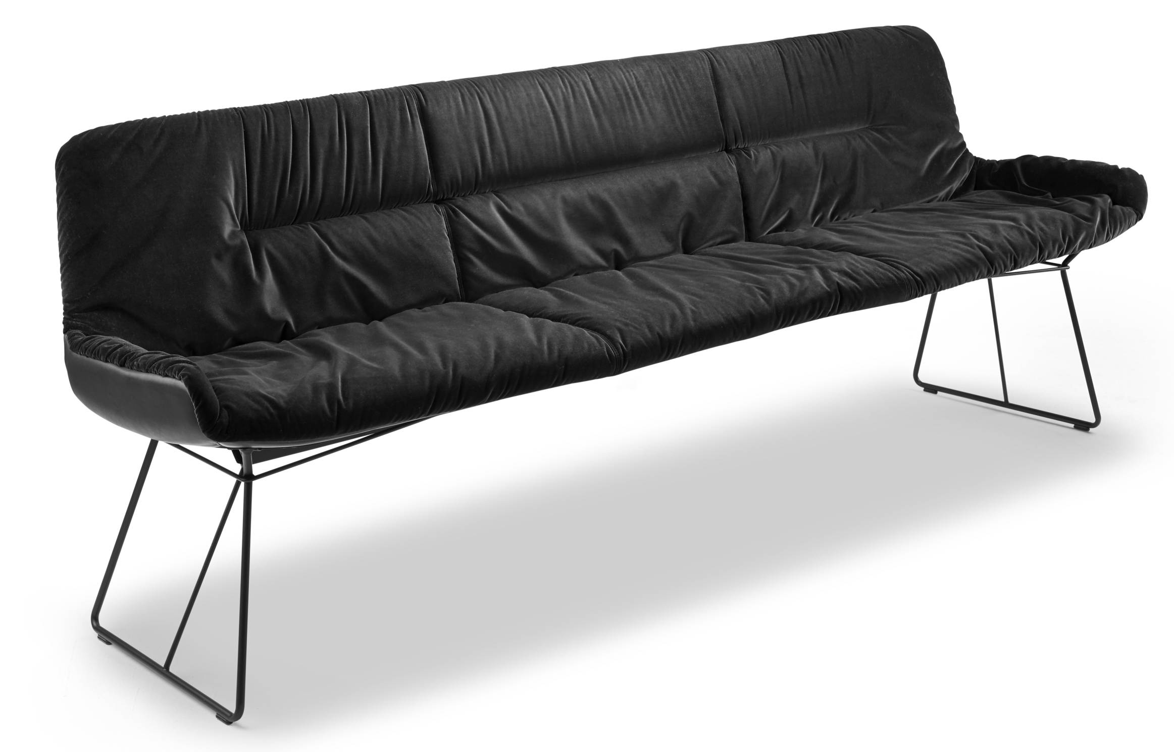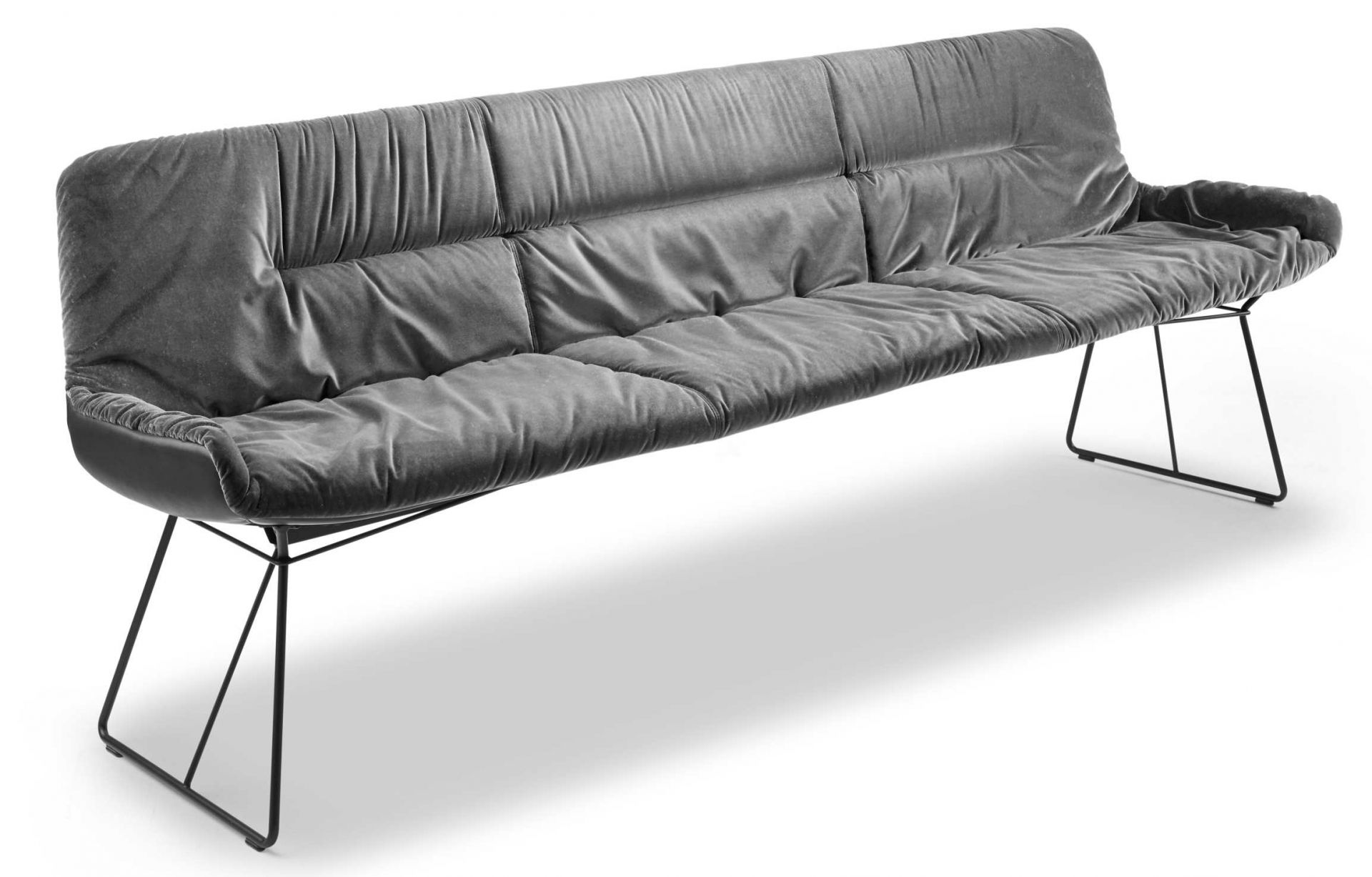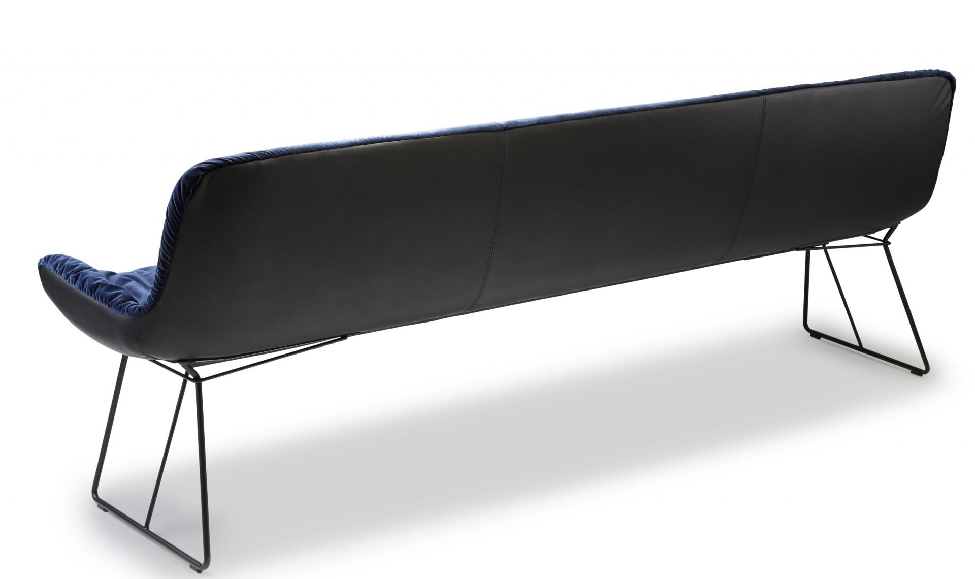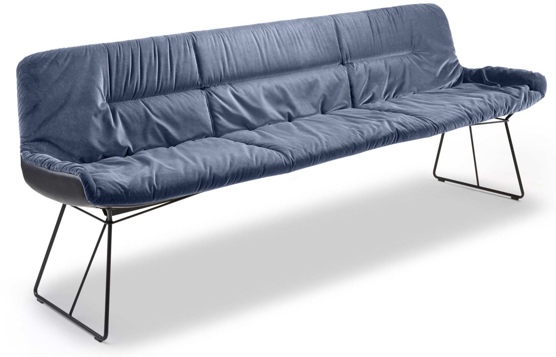 Le cadre en fil métallique filigrane confère au banc Leya de Freifrau Sitzmöbelmanufaktur un aspect particulièrement léger et peu encombrant. La coque extérieure rembourrée avec élégance est tendue serrée, tandis que le rembourrage intérieur est doux et câlin comme un grand coussin.