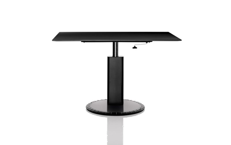 Magis 360° Table de Konstantin Grcic. Le réglage de la hauteur fonctionne de manière pneumatique. Pied en aluminium moulé sous pression. Piétement en aluminium profilé, supports en acier profilé. Plateau de table en MDF laqué noir. Épaisseur 2, 2 mcm. Largeur 140 cm, profondeur 90 cm, hauteur réglable entre 73 cm et 95 cm, le diamètre du pied est de 70 cm.