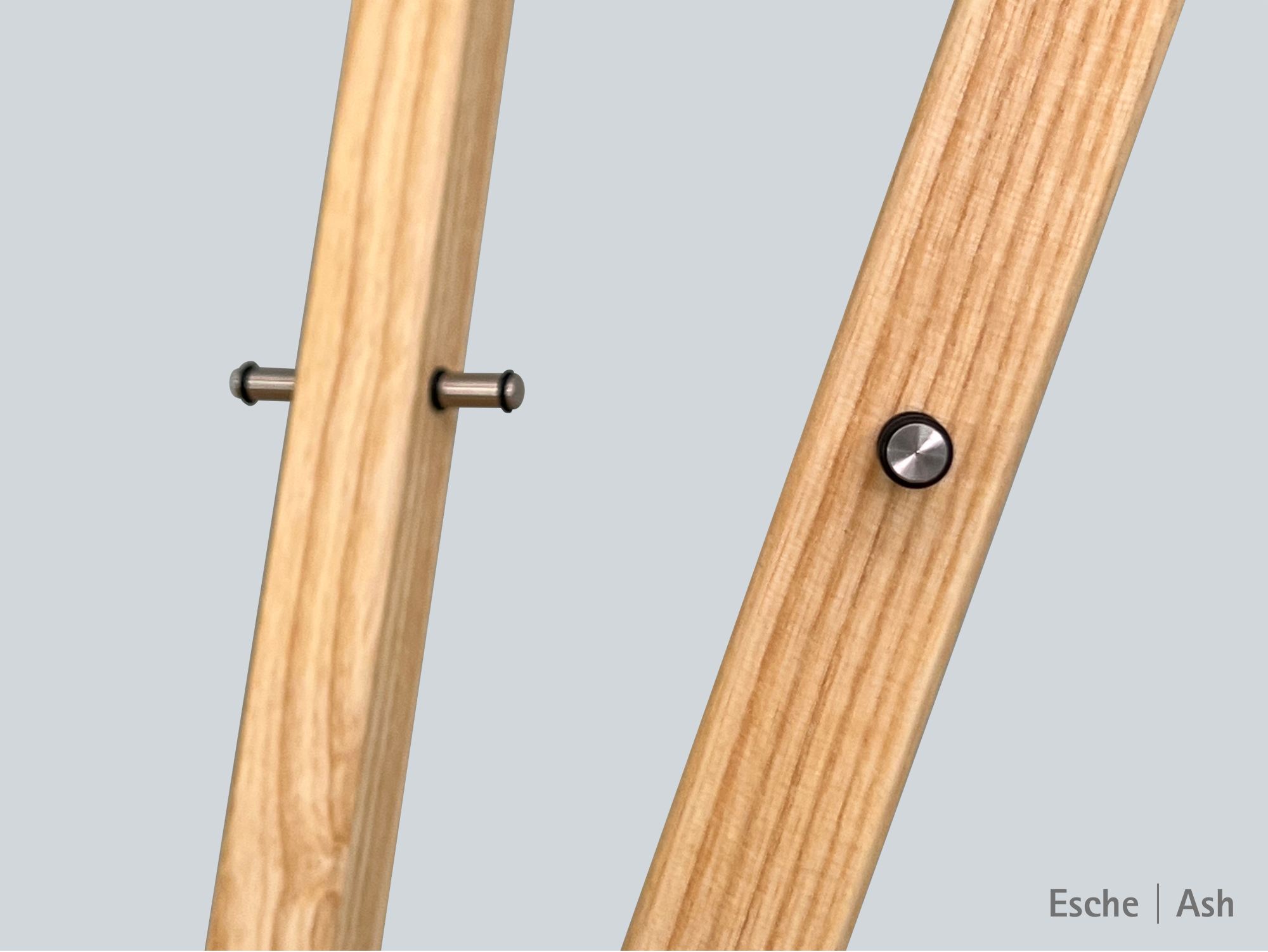Le porte-manteau est fabriqué en bois et en acier inoxydable. Elle est disponible en trois variantes : frêne huilé, chêne huilé et noyer huilé. Le portemanteau mesure 60 cm de diamètre et 162 cm de hauteur Il pèse 8,5 kg.