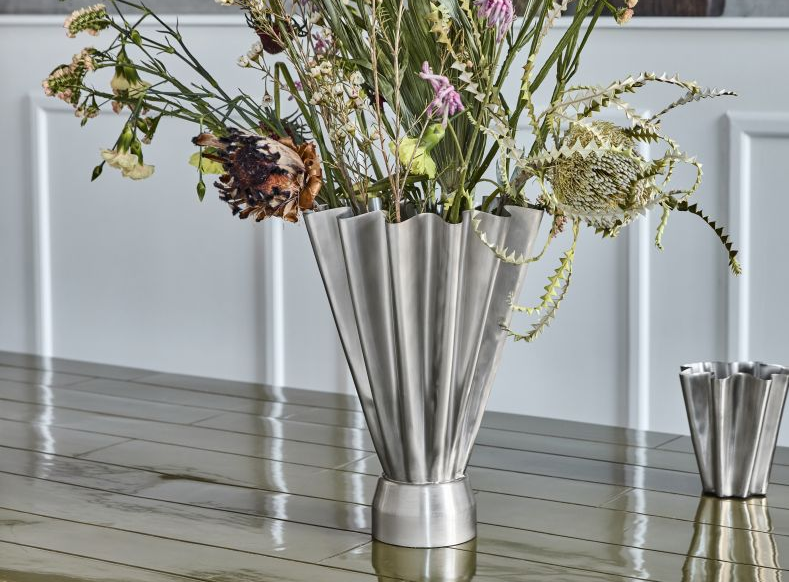 Le vase HDFlood étroit de House Doctor ravira particulièrement les amateurs de design industriel et sculptural : sa surface métallique brossée à la main et ses plis marqués lui confèrent un style puissant et moderne, qu'il soit utilisé seul ou avec quelques branches.