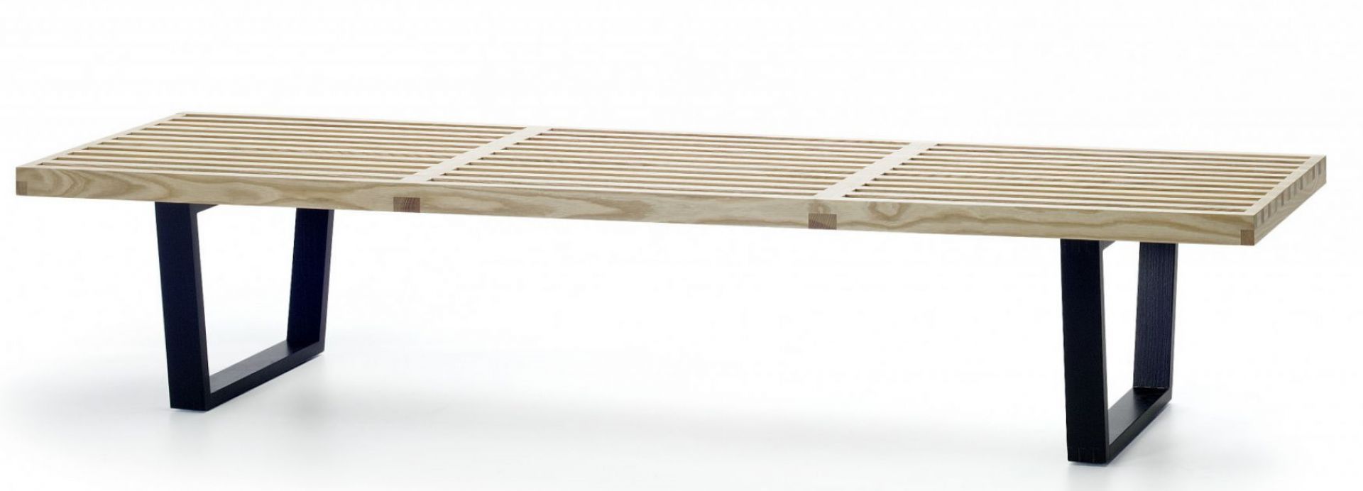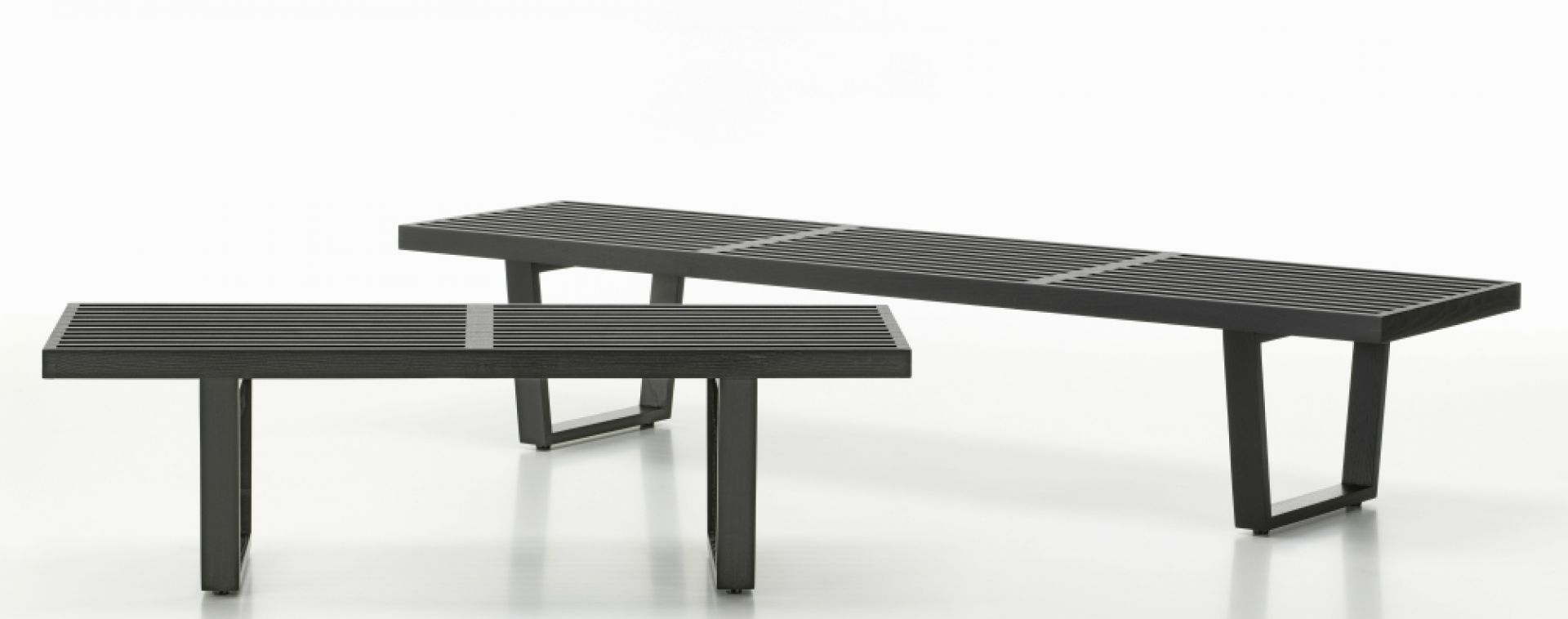 Le banc Nelson est composé d'une assise en lamelles de frêne et d'un piètement en bois de frêne laqué noir. Le bois provient d'Europe occidentale et/ou de Pologne. Le banc est disponible en deux tailles.