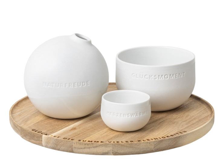 Le plateau est orné d'une citation gravée : "Le bonheur est la somme de nombreuses petites choses", qui souligne l'atmosphère de chaleur et de connexion. Chacun des bols porte les mots inspirants "joie de la nature", "moment de bonheur" et "chaleur du cœur", qui enrichissent les repas d'une signification et d'une sensualité supplémentaires.