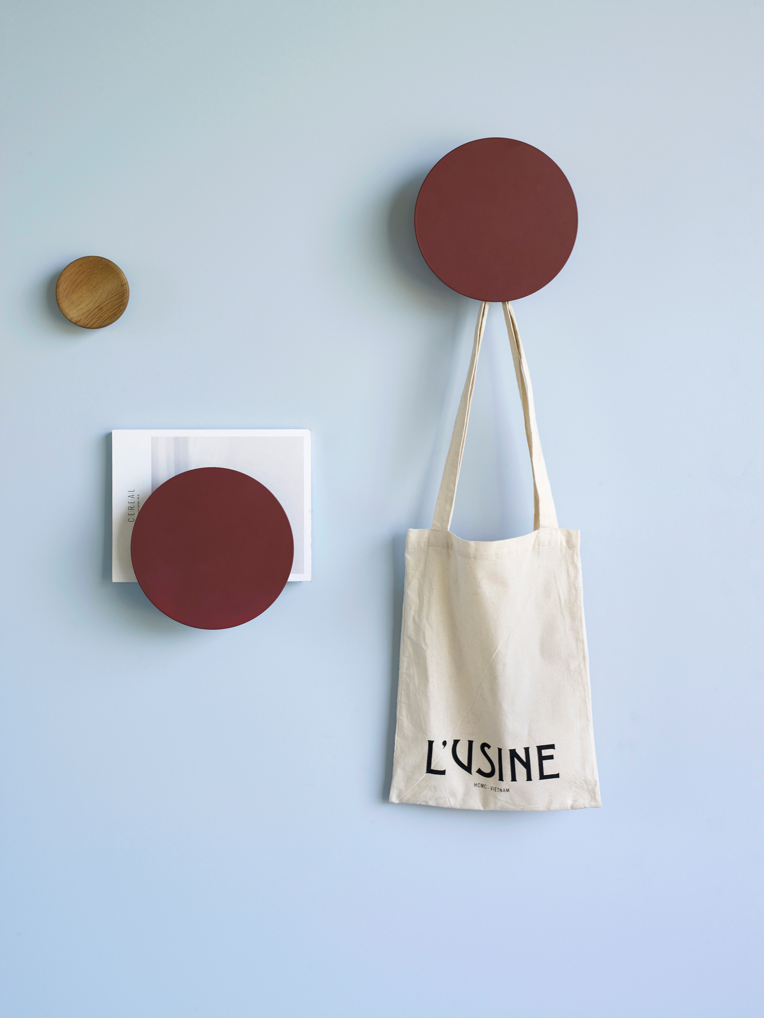 Avec le bouton métallique rouge, vous amenez vos magazines à hauteur des yeux : le disque métallique circulaire est fixé au mur et derrière lui, les magazines trouvent une place chic. Il y a un crochet à manteaux sur le petit crochet en dessous.