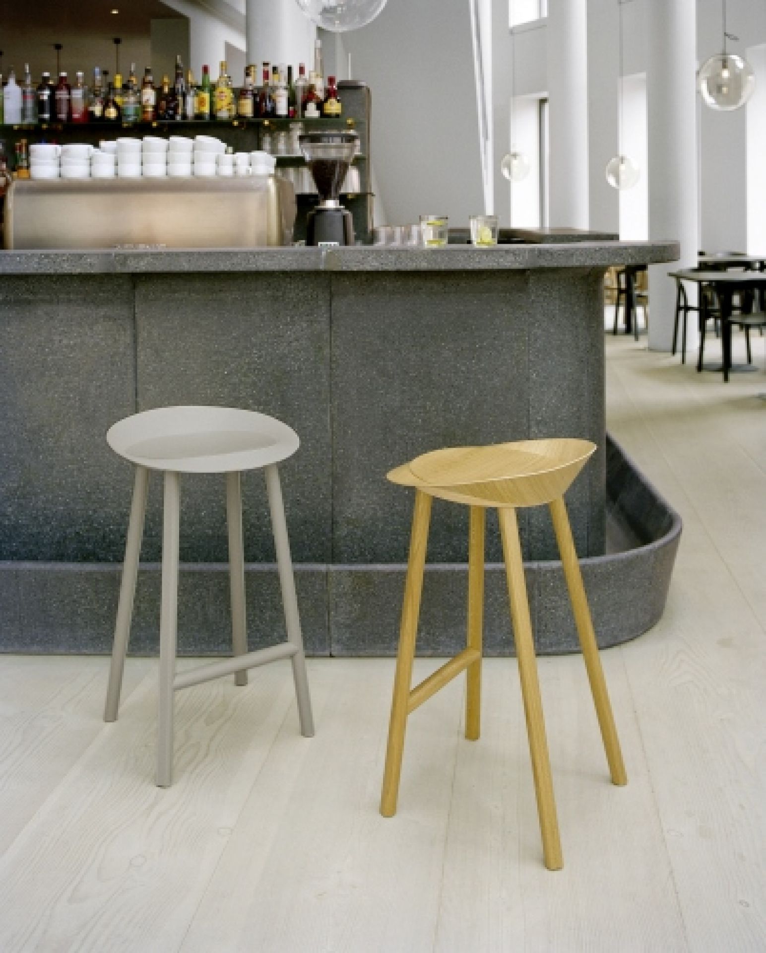 E 15 tabouret Jean de Stefan Dietz. St10 Jean consiste d' une assise avec bord péripherique qui procure un confort spécial et appui en état assis. Entre les pieds avant parcourt une contre-fiche avec lèvre plastique intégrée, qui sert comme repose-pied et qui donne stabilité au tabouret. Le tabouret St10 Jean , fabriqué de contreplaqué avec feuille de placage en chêne, laqué est disponible en deux hauteurs.