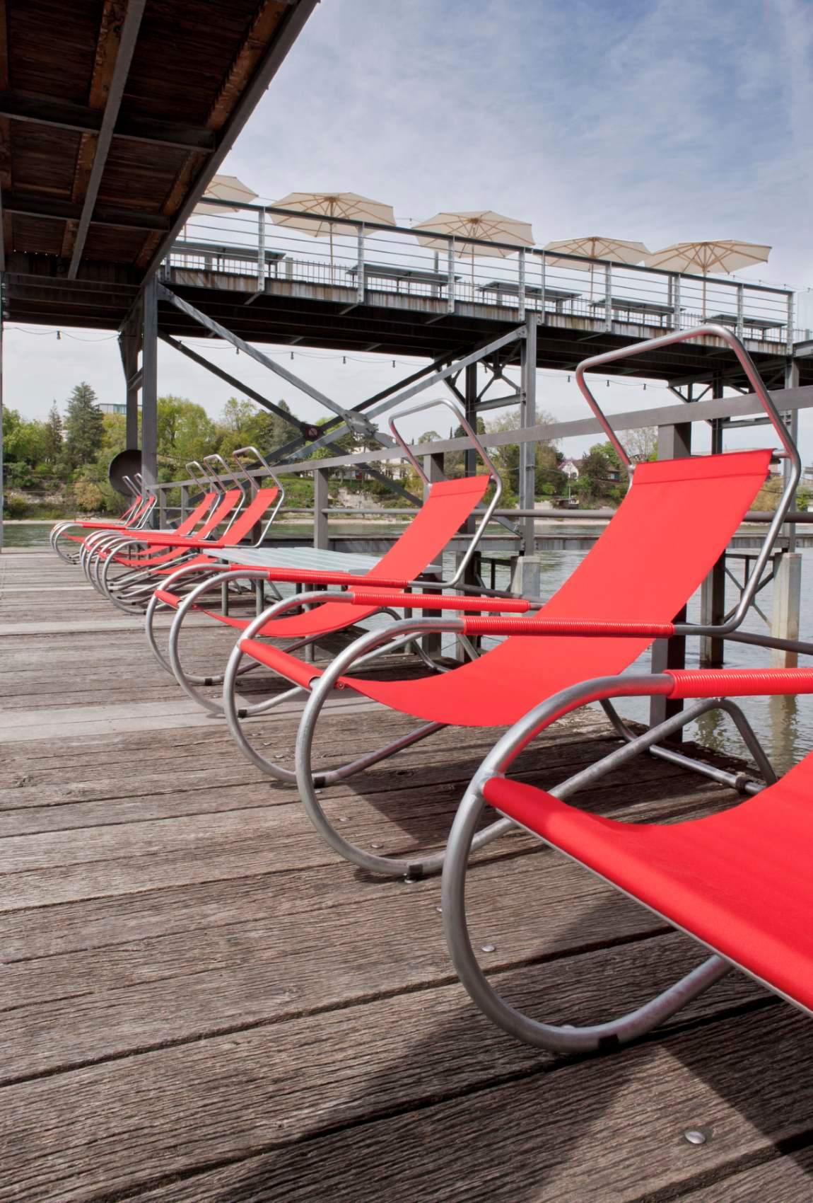 Dynamique : le transat Lido de wb form. Le classique a déjà été créé par Battista et Guid Giudici dans l’année 1936. Pour le 80ième anniversaire wb offre la chaise cantilever comme réédition avec un lin de qualité – un retour au tissu original d’auparavant.