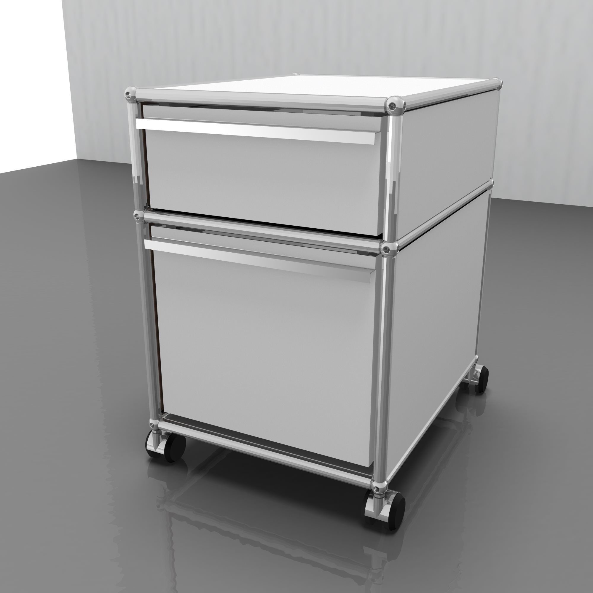 Comme convenable pour un chariot roulant, le modèle de USM est muni de roulettes souples. Vous pouvez le pousser donc d’une pièce à l’autre – idéal pour tous les globetrotters de bureau. L’atout spécial du chariot roulant est le dispositiv de suspension intégré.
